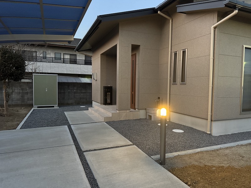 玄関アプローチ付近にはポールライトを設置して夜間でも歩きやすいようにしました。