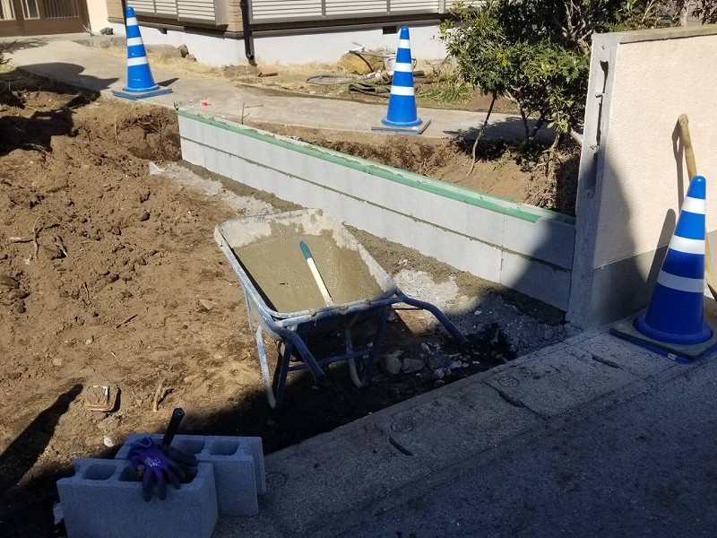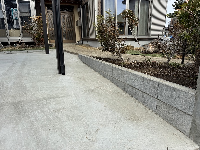 既存の玄関アプローチ舗装の地盤高さが高く、また新しく駐車スペースになるところの高さが低い為、土が流れないように土留ブロックを設置しました
