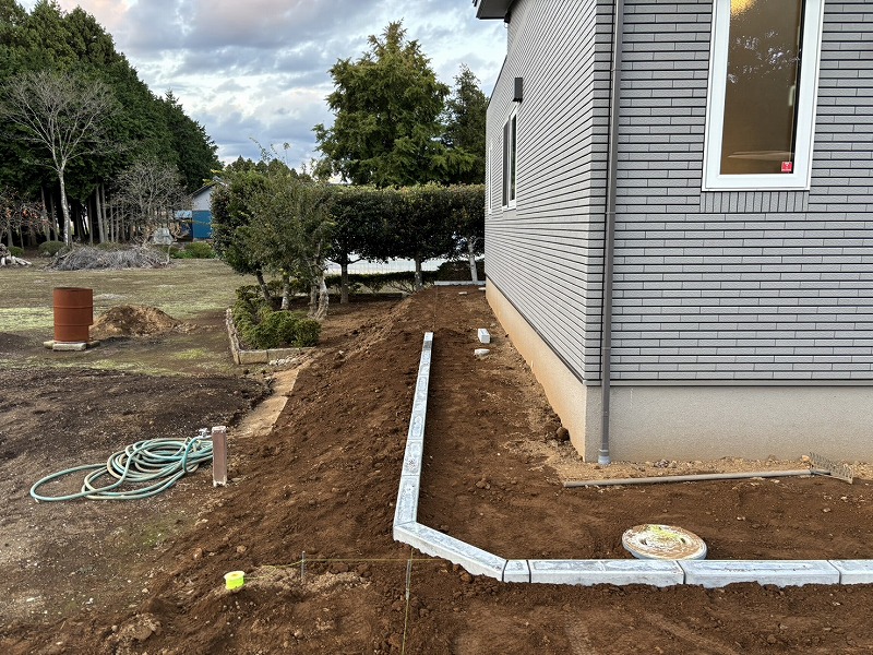 砂利が流れ出ないように、建物裏側と同様に見切りコンクリート縁石を敷設していきます