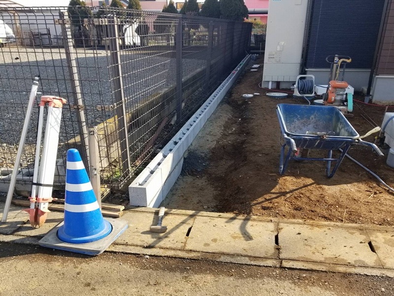 ブロック基礎用の穴を掘り、基礎砕石を敷き込みます。