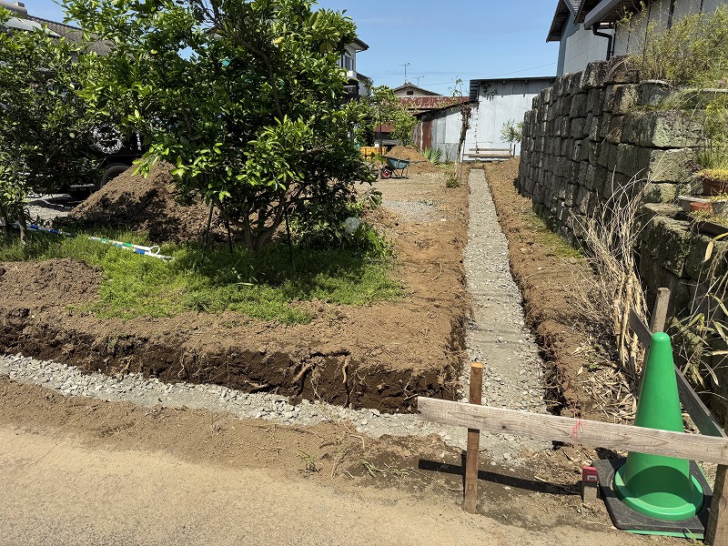 ⇧②ブロックベース基礎+基礎砕石敷き均し状況