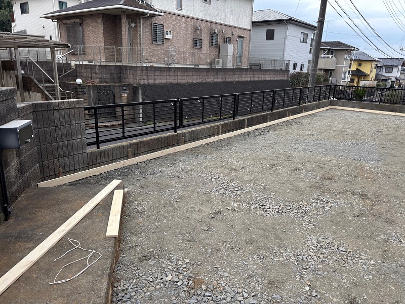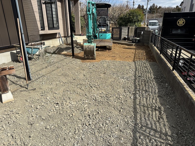 こちらはコンクリートの下地作りとして、C-40-0砕石を敷き均してしっかりと固めていきます