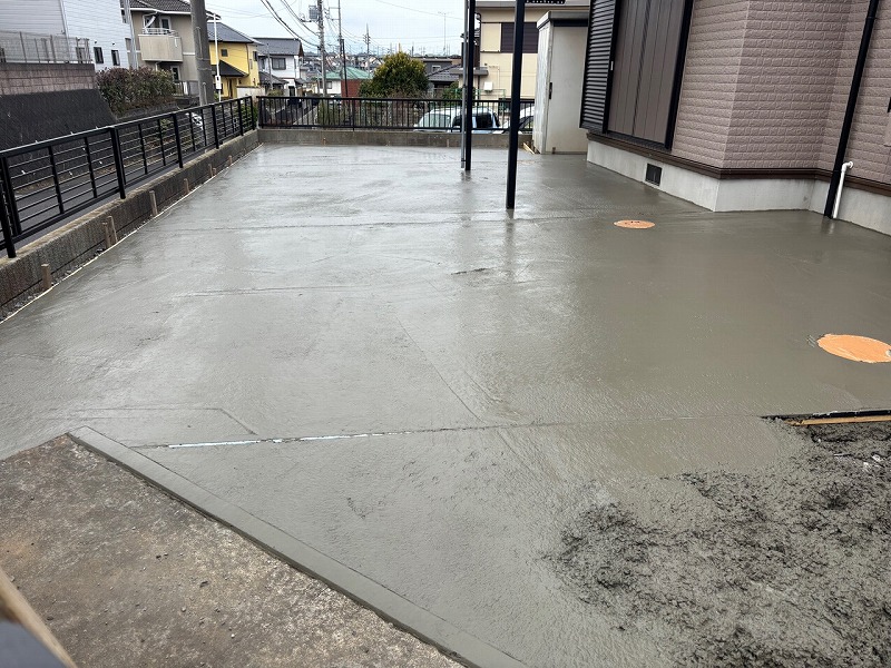 気温や生コンの水分量、また乾き具合も影響するのが土間コンクリート打設。