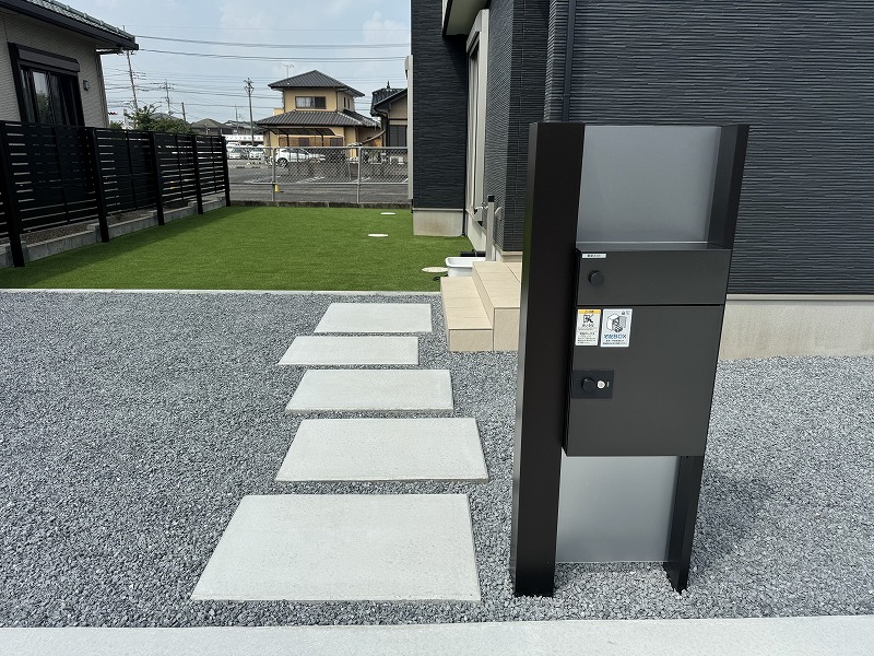門柱は黒と透明のガラス調が使われていて、シンプルなデザインで