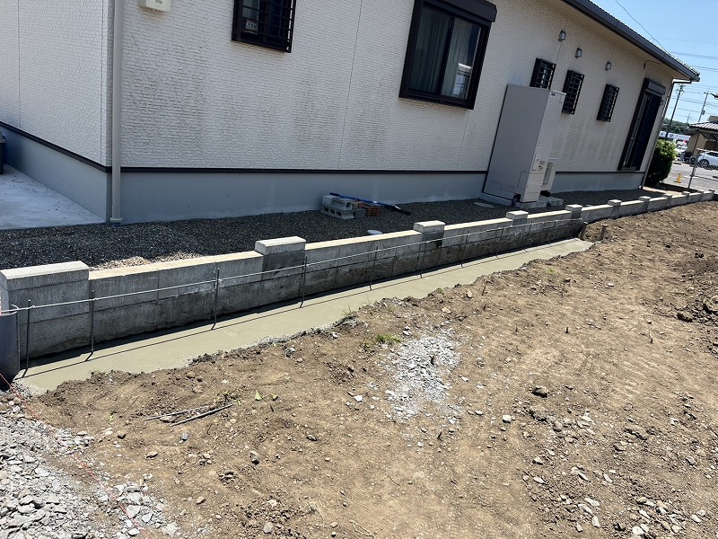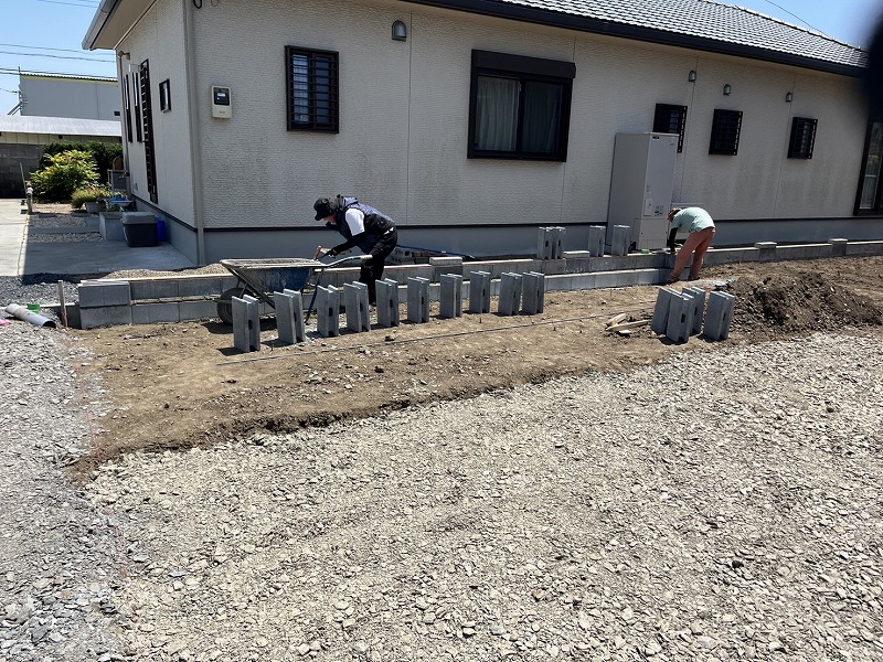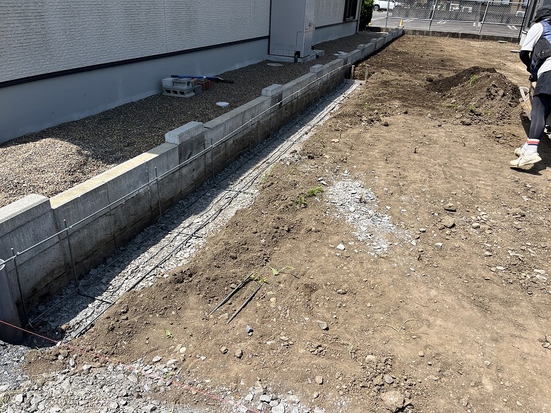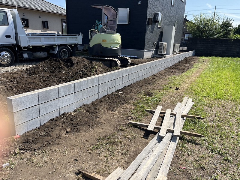建物裏側は高低差がありますので、土留めを兼ねてブロックを設置していきます