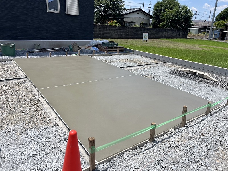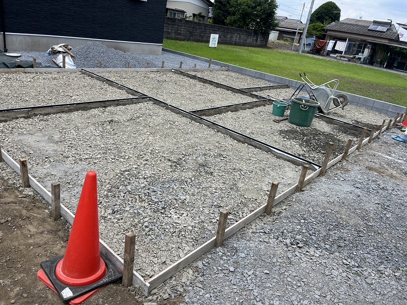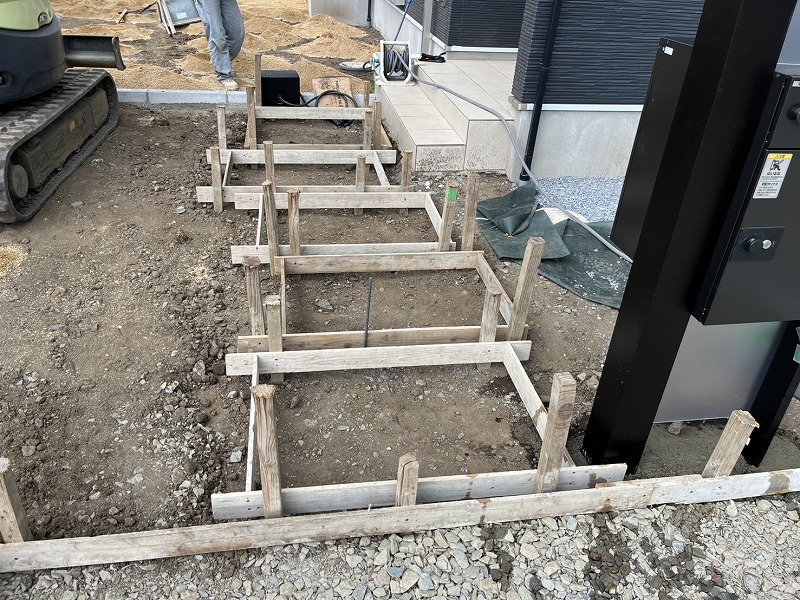 基礎砕石を敷き均して型枠を設置後、生コンを流し込んでいきます。